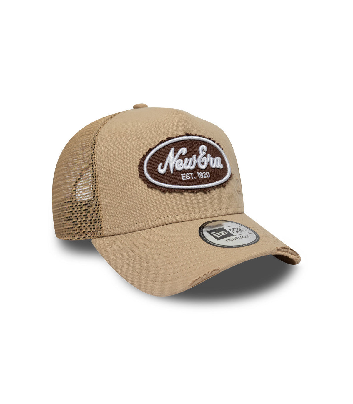 - Panel frontal en beige neutro con parche New Era bordado